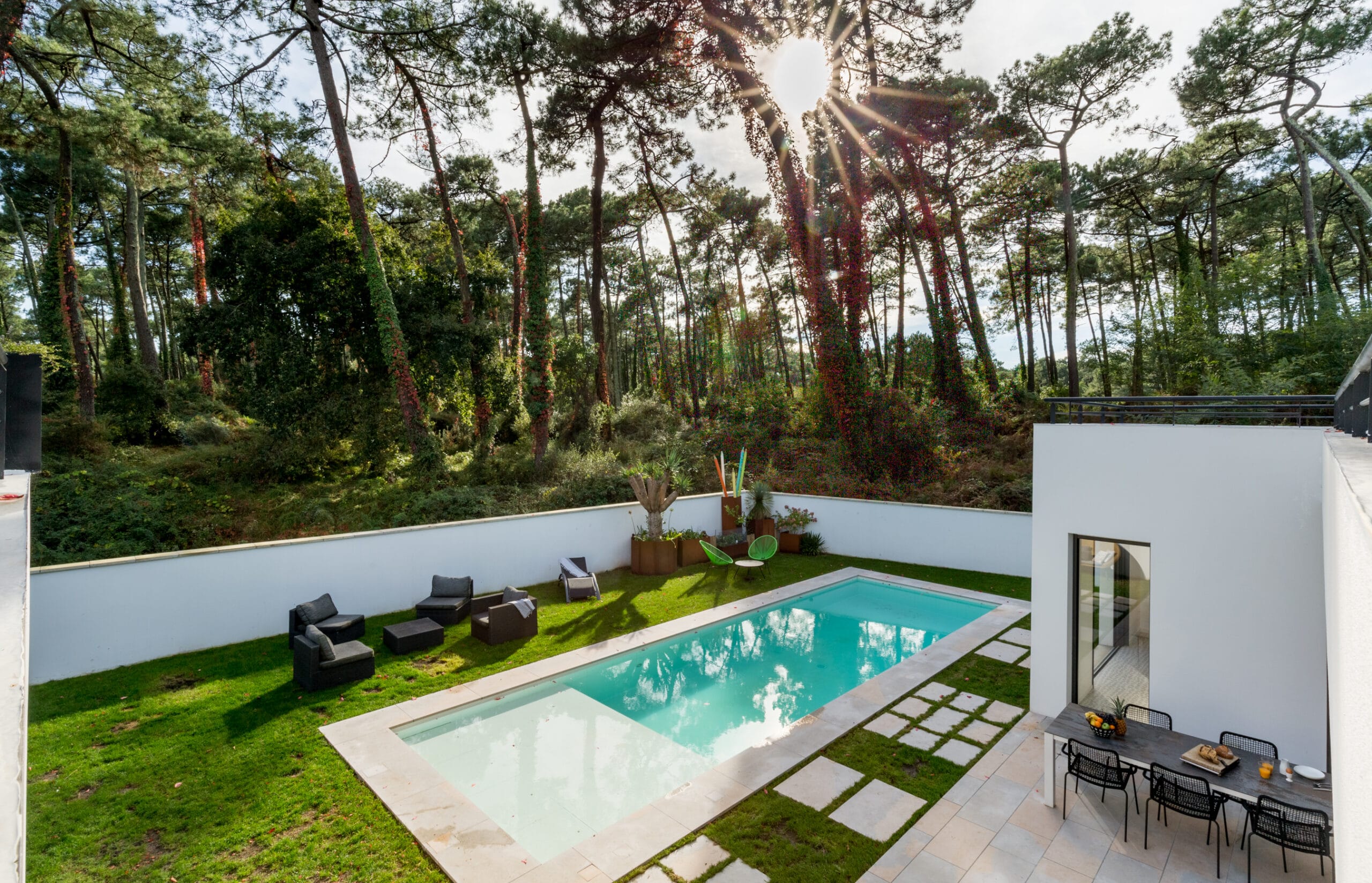 Le rez-de-chaussée de la villa comprend un salon avec cheminée, une cuisine ouverte et une grande table à manger. Le salon peut être entièrement ouvert sur la terrasse, qui abrite également une table à manger en plein air, plusieurs espaces de détente avec des sièges extérieurs et des chaises longues au bord de la piscine. Tout cela est encadré par de grands pins de la forêt qui commence juste à l’extérieur de la villa. Au rez-de-chaussée, vous trouverez également la suite parentale avec un grand dressing et une salle de bain attenante. La chambre principale, le dressing et la salle de bains sont tous dotés de grandes fenêtres du sol au plafond et donnent sur la pelouse verdoyante du jardin.